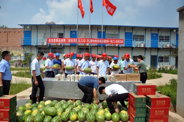 8月7日,我集團公司王曉帥、許海軍、呼澤鋒等一行來到汝州市2018年易地扶貧搬遷夏店鎮二期建設項目施工現場,為工作在施工一線的工友們送上了毛巾、花露水、飲料、藿香正氣丸、仁丹、西瓜等防暑降溫大禮包,力爭為一線職工提供一個舒適的工作生活環境,保證高溫作業條件下一線職工的安全和健康,并一再囑咐項目部一定要做好高溫季節施工防暑工作,切實將安全放在首位,確保安全生產。
