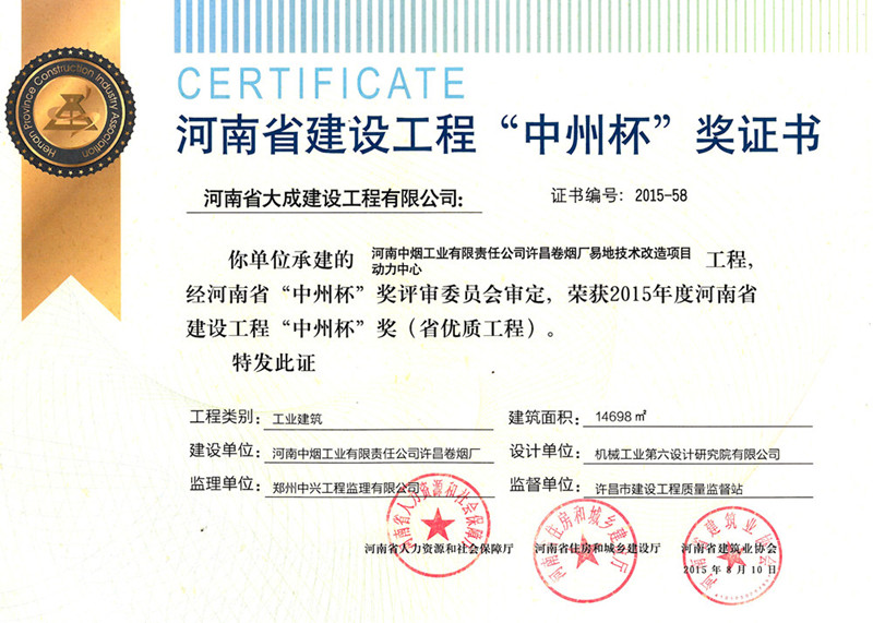 8月23日,“2015年度河南省建筑業(yè)企業(yè)精品工程經(jīng)驗交流會”在鄭州順利召開,會上對獲得2015年度河南省建設(shè)工程“中州杯”獎的企業(yè)進行了頒獎表彰。由我集團公司承建的“河南中煙工業(yè)有限責(zé)任公司許昌卷煙廠易地技術(shù)改造項目”榮獲2015年度河南省建設(shè)工程“中州杯”獎(省優(yōu)質(zhì)工程)。