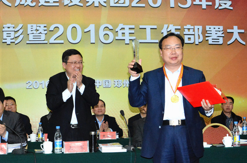 洛陽市人民政府副市長、原林州市委書記王軍為張獻軍董事長頒發紅旗渠精神獎章